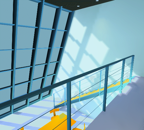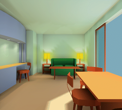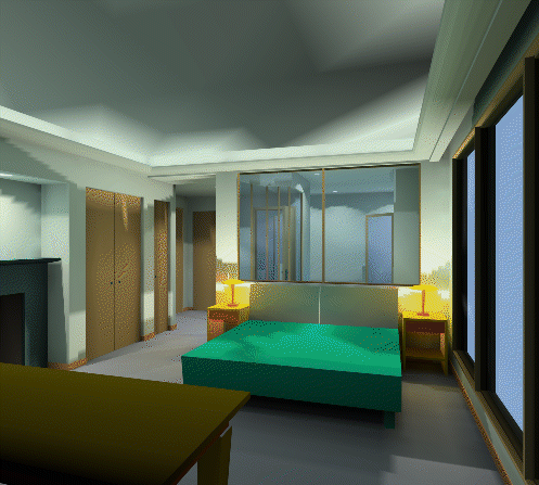 To demonstrate the GS2 application in architectural design review, the CEDeS Lab designed and developed a number of hotel guest rooms. This program was selected because the content was simple to implement and represent, yet allowed enough variety of design to enable effective demonstration of the GS2 application tools. Along with a vestibule and hallway, three hotel guest rooms were designed and built. Each of the guest rooms was represented as several design alternatives: an empty, flat-shaded space; an empty space with "realistic" lighting; and a number of furnishing and lighting alternatives. The participants, represented as "avatars" with heads and hands, could interact with each other in real-time to evaluate and critique the designs.