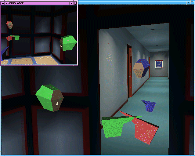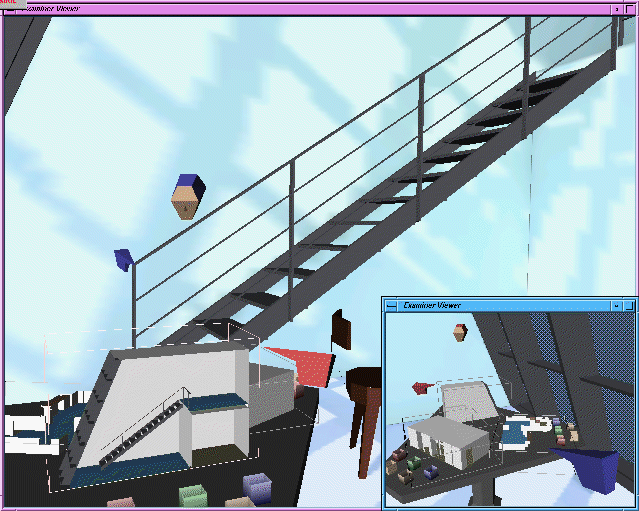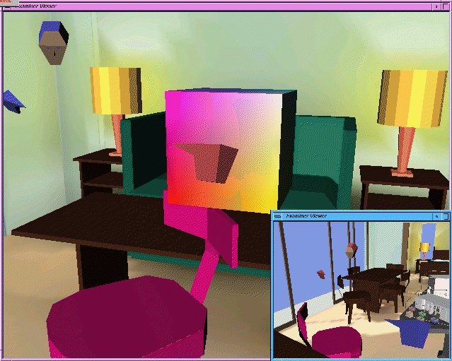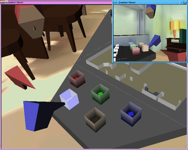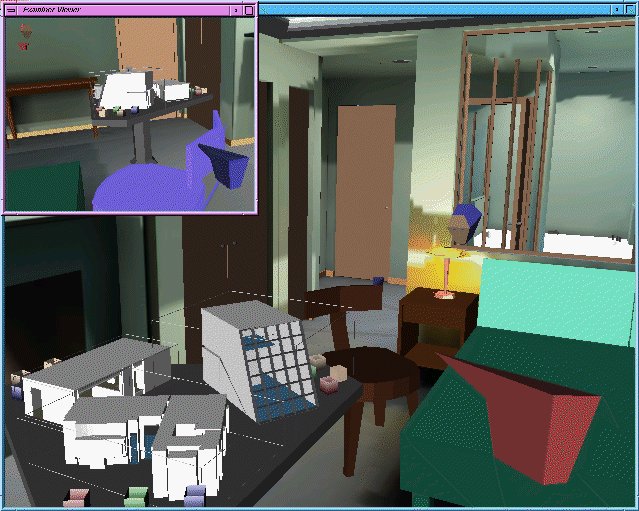 The GS2 application provided a "worktable" in each design alternative, on which scale models and tools were placed for use by the participants. The tools, implemented to facilitate interaction between participants, enabled navigation within and between alternative designs, communication between participants, and manipulation of the environment itself. Navigation within the environment was accomplished using standard Inventor tools and with virtual interfaces including six-degree-of-freedom controllers, magnetic trackers, and head-mounted displays. Navigation between room alternatives was implemented with hyperlink technology: hyperlinked doors switched participants between adjacent rooms and icons on the worktable "transported" participants between non-contiguous spaces.