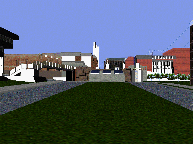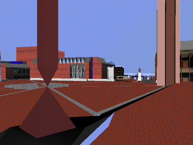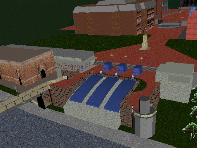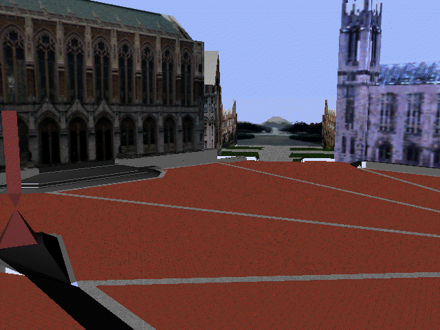 In fall of 1994, the Virtual Environments Class developed a model of Charles Gwathmey's proposed addition to the UW Henry Art Gallery. The virtual world was based on digital information provided by LMN Architects, and was used to demonstrate the ability of real-time simulation technology to represent an architectural proposal. The gallery addition was modelled in the context of Red Square, the central plaza of the University of Washington campus which offers views of the Olympic Mountains and Mt. Rainier.