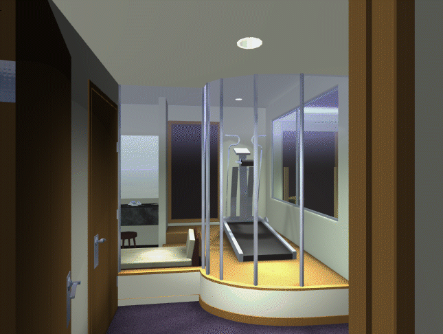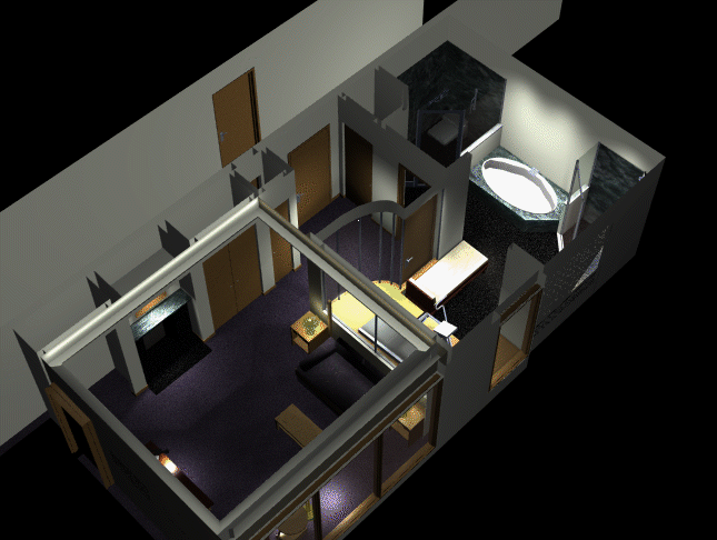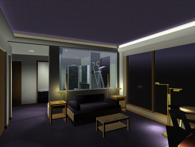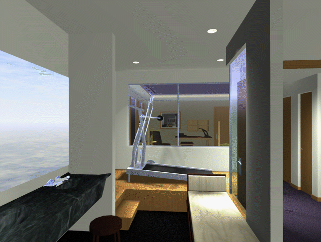 In winter of 1995, staff and students at the CEDeS Lab undertook a project simulating an architectural interior for Westin Hotels. Westin Hotels is interested in the design and development of hotel rooms tailored to the business traveler of the 21st century. They provided a design of a guest room, which the CEDeS Lab modeled and simulated as an animation. The guest room features a large bathroom complete with an exercise area, a bed which folds to a sofa for daytime use, and glass of variable transparency controlled by the hotel guest.