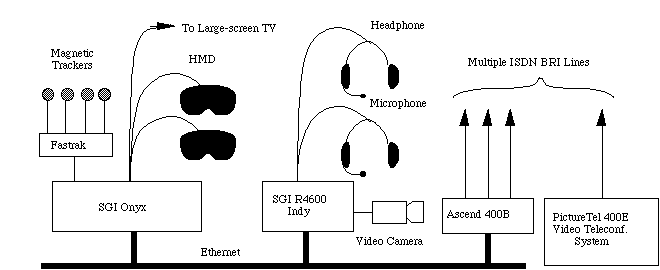 We also used a conventional video teleconference system so that the crowds can see each other. The teleconference system required one additional BRI line.
